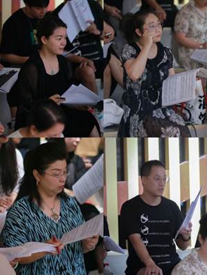 王希珍老师的课堂内容主要包括三个部分,一是对学员们进行音域的练习,二是回答学员们在训练合唱过程中遇到的问题,三是以《敕勒歌》为例,对学员们进行合唱的训练。